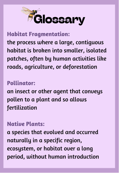 Pollinators are some of the many categories of animals that suffer greatly from environment fragmentation, which is where an ecosystem is broken up into small sections, usually by things like roads or agriculture, which separates the different parts of an ecosystem.